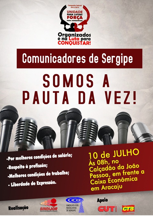 Organizados e na luta para conquistar: Esse é o mote da campanha conjunta dos comunicadores que foi aprovado na última assembleia. Além do ato público que acontece dia 10, as duas categorias vão buscar apoio de outros sindicatos e também a intermediação de parlamentares para fortalecer o movimento por valorização dos comunicadores de Sergipe.
