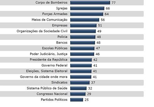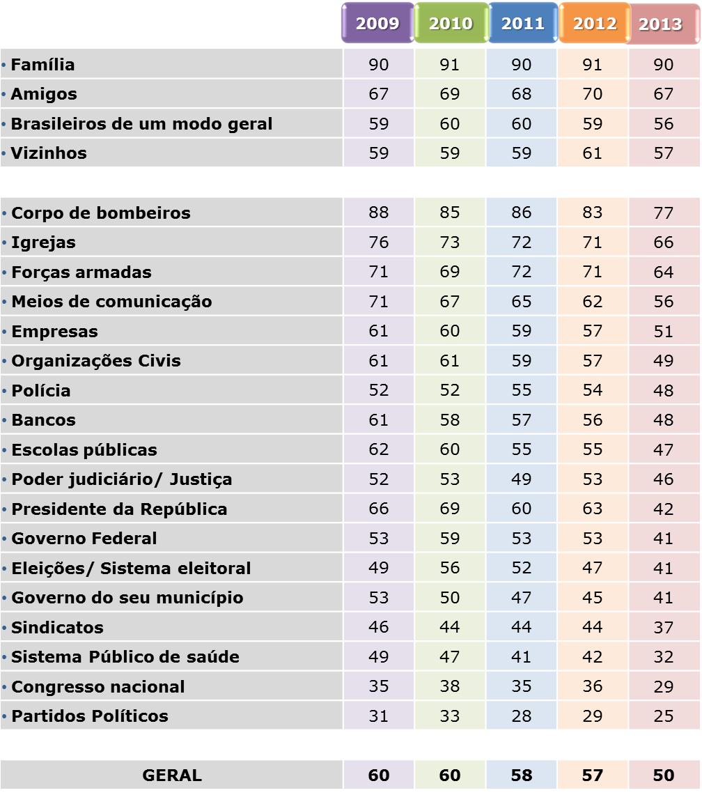Em 2009, o número era de 71. De maneira geral, o brasileiro está mais desconfiado de tudo, tanto que a confiança nas instituições e nos grupos sociais caiu 7 pontos em relação ao ano passado. Segundo o Ibope, o resultado reflete o atual momento de protestos e críticas que ocorrem pelo país.