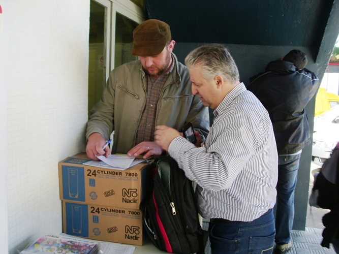 Os dirigentes estão não só sindicalizando e ressaltando a importância desse ato político, como também estão divulgando a nossa nova carteira de sócio recentemente implantada e confeccionada em PVC, e presenteando a categoria com copos tubo com a nova logomarca comemorativa aos 50 anos do Sindicato, revistas e pad mouse da Federação.