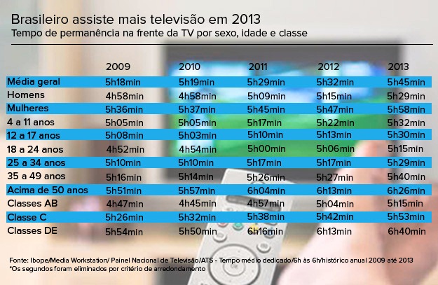 Foi o maior aumento de consumo de TV nos últimos cinco anos. Em 2012, o brasileiro viu três minutos a mais de TV do que em 2011, quando assistiu dez minutos a mais do que em 2010 (veja tabela abaixo).