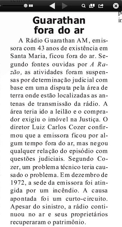 Lamentável o noticia que está publicada na edição de hoje do Jornal A RAZÃO de Santa Maria. A Rádio Guarathan está fora do ar, tendo acessos somente através da internet. Há 53 anos no ar, e não 43 como o texto do jornal declara (fundada em 23/04/1960), a emissora possui uma história que não deve ser jogada no lixo. Esperamos que a emissora resolva a sua situação na justiça para voltar ao ar. Confira a seguir, a reprodução do texto publicado na edição de hoje: