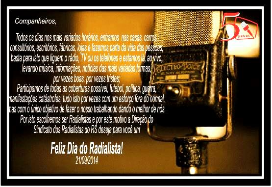 O diretor Ricardo Malheiros, em nome de toda a direção, encaminhou para alguns contatos de nossa lista de e-mails, um cartão personalizado de nossa entidade como demonstração de carinho e respeito à categoria pela passagem do DIA DO RADIALISTA. Àqueles que não integram a listagem, o reproduzimos nesse espaço para ampliar a um maior número possível da categoria, essa simpática mensagem que valoriza e homenageia o trabalho do radialista.