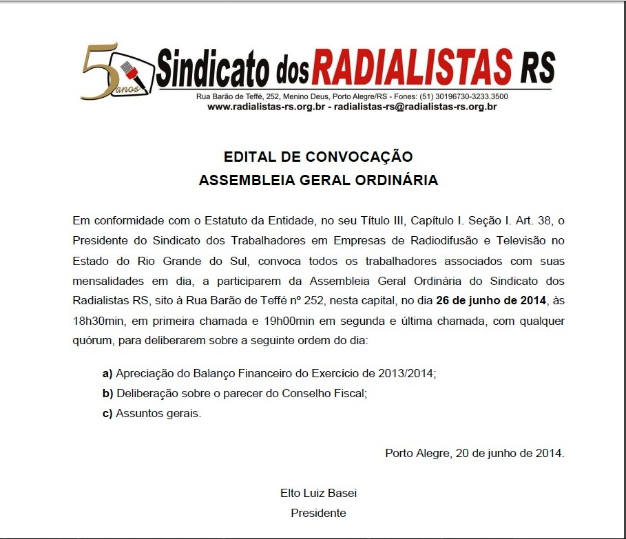 Em conformidade com o Estatuto da Entidade, no seu Título III, Capítulo I. Seção I. Art. 38, o Presidente do Sindicato dos Trabalhadores em Empresas de Radiodifusão e Televisão no Estado do Rio Grande do Sul, convoca todos os trabalhadores associados com suas mensalidades em dia, a participarem da Assembleia Geral Ordinária do Sindicato dos Radialistas RS, sito à Rua Barão de Teffé nº 252, nesta capital, no dia 26 de junho de 2014, às 18h30min, em primeira chamada e 19h00min em segunda e última chamada, com qualquer quórum, para deliberarem sobre a seguinte ordem do dia: