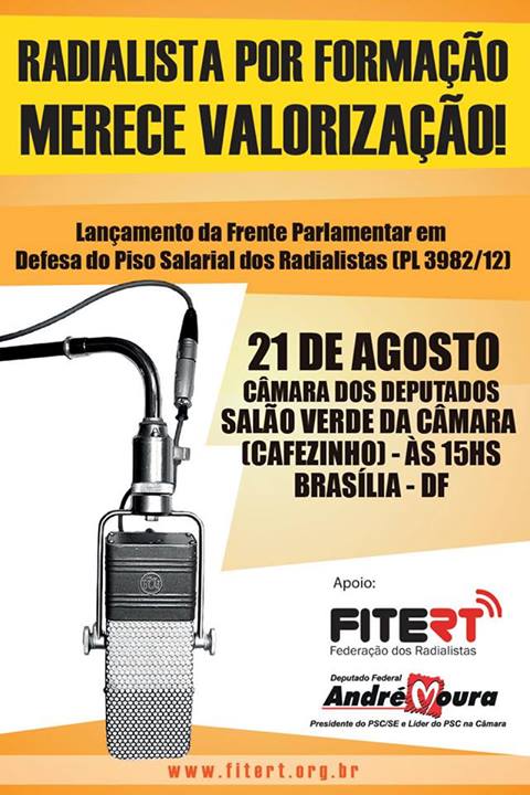 Na tarde desta quarta-feira (21), foi realizado no salão verde da Câmara dos Deputados o evento de instalação da Frente Parlamentar em Defesa do Piso Salarial dos Radialistas, presidida pelo líder do PSC, deputado federal André Moura (SE), autor do projeto de lei 3982/2012, que assegura aos radialistas piso salarial, fixado com periodicidade mínima anual mediante convenção ou acordo coletivo de trabalho, referenciado por jornada de trabalho e respectivos setores de atuação. O objetivo da Frente Parlamentar é garantir o apoio de parlamentares e partidos para a aprovação da proposta.