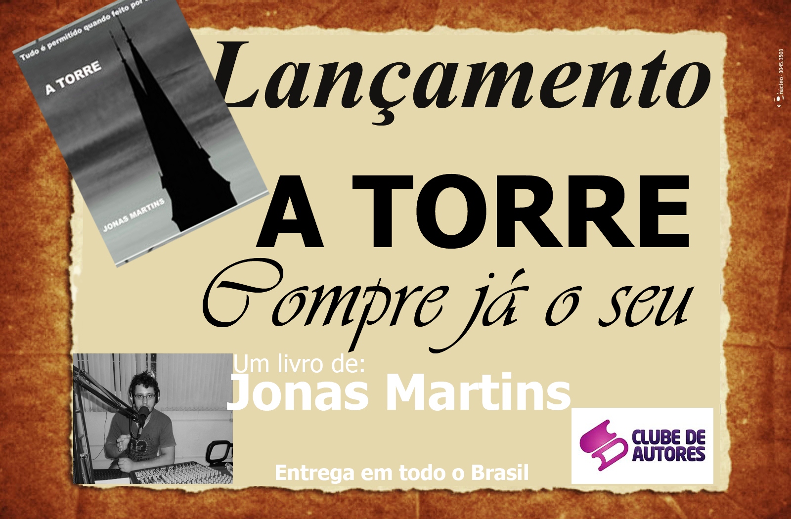 Este ano Jonas decidiu arriscar lançando seu primeiro romance: A torre. A obra lançada no início do mês de março já um dos livros mais requisitados na loja do Clube do Autor e na distribuidora Teixeira, empresa que distribui os livros do autor nos estados de Rio de Janeiro, São Paulo, Minas Gerais, Bahia e Espirito Santo.