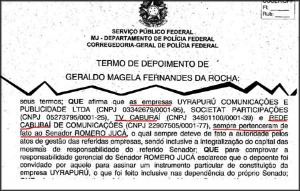 Em depoimento à Polícia Federal, Geraldo Magela confirmou a entrevista concedida ao site há três anos. Disse que a TV Caburaí, o canal 8 de Boa Vista (RR), afiliada à TV Bandeirantes, tinha como real dono o senador Romero Jucá, apesar de estar registrada em nome de uma fundação, alugada para uma empresa e, hoje, registrada em nome de outra firma pertencente à família do parlamentar. “Que afirma que as empresas Uyrapuru Comunicações e Publicidade, Societat Participações, TV Caburaí e Rede Caburaí de Comunicações sempre pertenceram de fato o senador Romero Jucá, o qual sempre deteve de fato a autoridade pelos atos de gestão das referidas empresas, sendo inclusive a integralização do capital das mesmas (sic) de responsabilidade do referido senador”, disse o lobista à Corregedoria da PF em Brasília, em 5 de novembro.