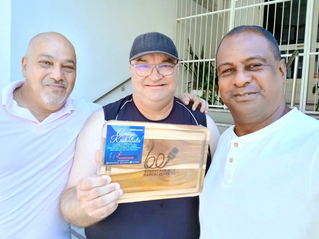 Já no retorno para a cidade de Santa Maria, os diretores estiveram na Rádio da Rede Aleluia 104.7 FM onde o Diretor e Tesoureiro Daniel Braga foi recebido pelo Pastor Romildo e aproveitou para conversar com o radialista Joel Gentil e efetuar a entrega da lembrança do Sindicato.