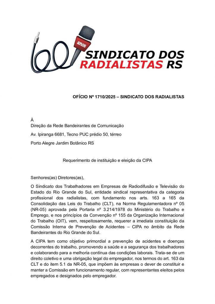 Colegas Radialistas, a Direção do Sindicato dos Radialistas do RS sempre atenta às necessidades de nossa categoria e com o objetivo de buscar melhoria na qualidade do trabalho e segurança dos colegas, remeteu na data de hoje 20 de outubro de 2025 por e-mail, o ofício nº 1710/2025 para o Grupo Bandeirantes Porto Alegre, Requerimento de instituição e eleição da CIPA, leia a integra abaixo.