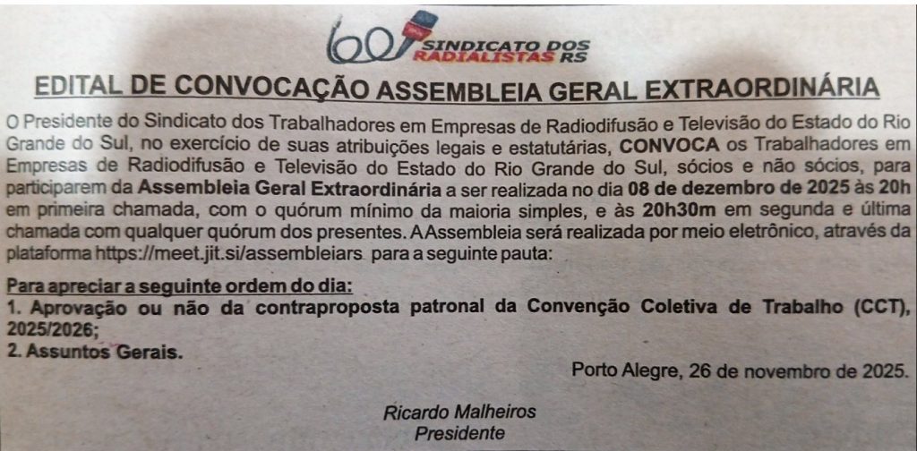 Amigo radialista do Rio Grande do Sul, o Presidente do Sindicato dos Trabalhadores em Empresas de Radiodifusão e Televisão do Estado do Rio Grande do Sul, convida os Trabalhadores em Empresas de Radiodifusão e Televisão do Estado do Rio Grande do Sul, sócios e não sócios, para participarem da Assembleia Geral Extraordinária no dia 08 de dezembro de 2025.