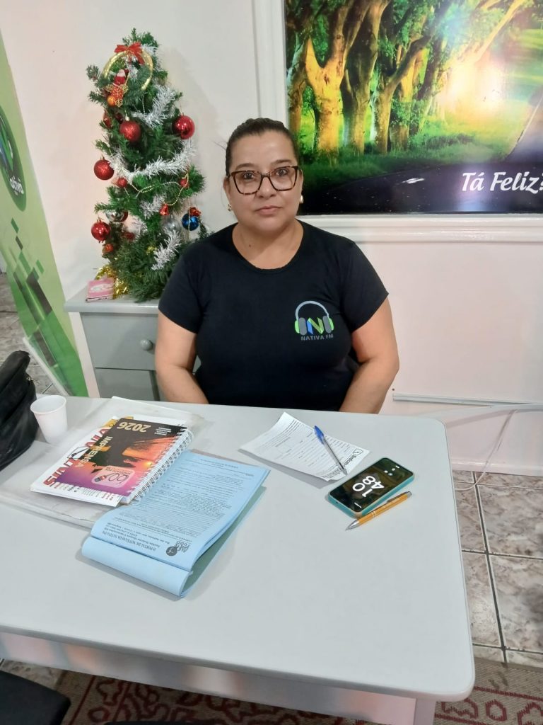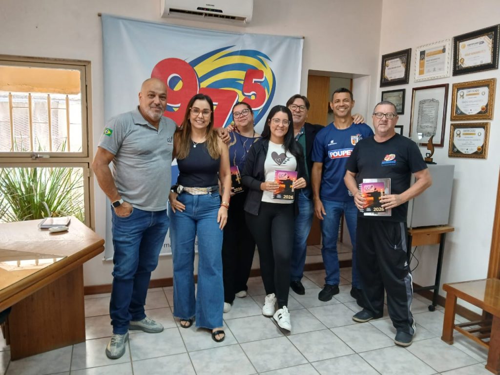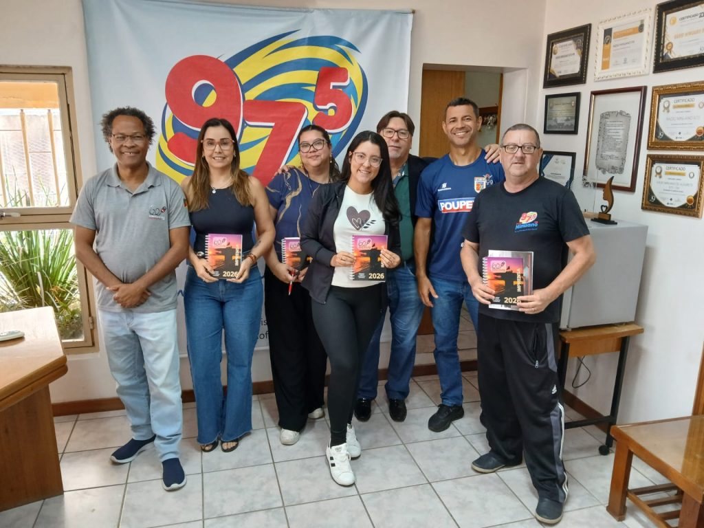 Na sequência, os diretores Ricardo Malheiros e Silvonei Benfica estiveram na Rádio Nativa FM 105.9. Na oportunidade, além da entrega da Agenda 2026 e do informativo Sintonia, foi possível dialogar com os profissionais da emissora e celebrar a conquista de uma nova sócia, a quem a direção do Sindicato dá as boas-vindas.