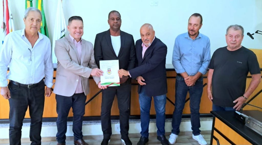 SANTIAGO – Na manhã desta sexta-feira, a Câmara Municipal de Santiago realizou uma cerimônia de homenagem à diretoria do Sindicato dos Radialistas do Rio Grande do Sul. O presidente da entidade, Ricardo Malheiros, e o diretor-tesoureiro, Daniel Braga, foram recebidos no gabinete da presidência do Legislativo para a entrega da honraria.